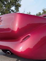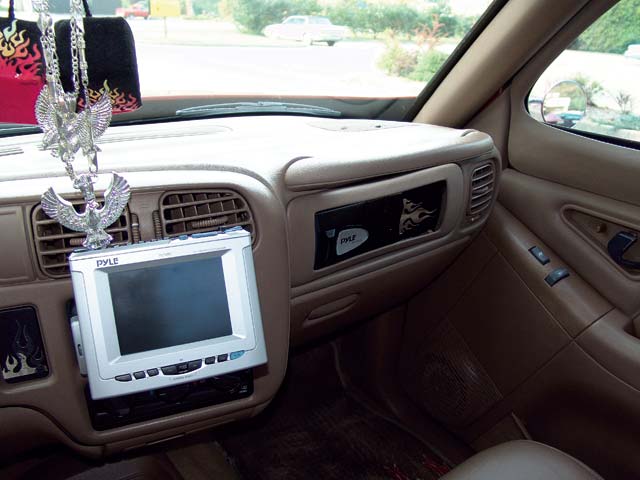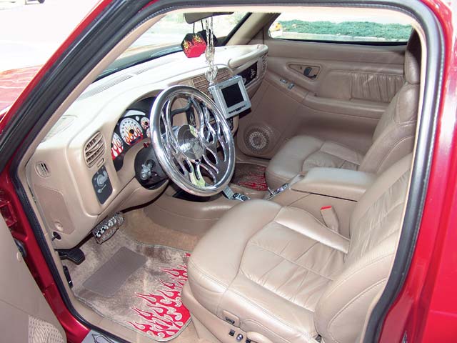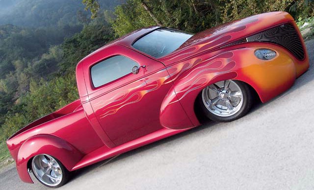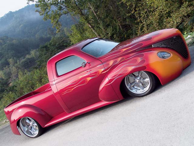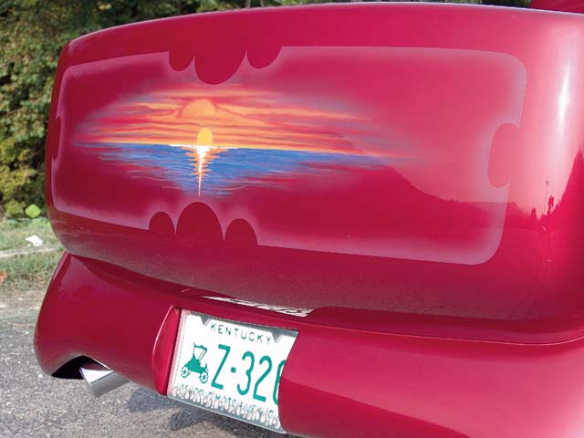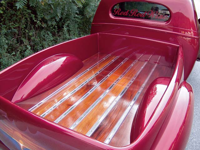 | Since the body of the kit was all fiberglass, it came void of any door handles, emblems, or any of the other parts most people spends hours trying to shave. This made for a clean look, right off the bat. The taillights are a pair of 9-inch tear-drop rod lights, and the headlights are out of a Ford Taurus, while the inside of the bed has received a mahogany wood treatment with stainless strips between the wood slats. The truck already had a clean cherry-red metallic-pearl PPG base when they got it, but it still needed a little extra detail. Glen and Patricia took the truck over to Terry Kincaid in Lawrenceburg, Kentucky, to get the front end flamed. For this, Fire Engine Red, Poppy Orange, Goofy Purple, and white were used and all striped out in orange. Terry is also responsible for the mural on the rear of the bed. Most of the interior is pretty much stock, taken out of the S-10 Blazer donor used for the base of the truck, leather seats, and all. A full billet Colorado Customs steering wheel and center console out of an S-10 pickup round out the interior. All their hard work definitely paid off. |