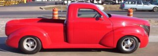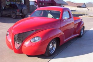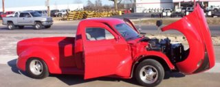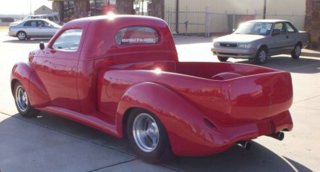 Details: The engine is a 400 small block with a B & M Supercharger and twin side-draft Mikuni carbs with an awesome 450 horsepower. The transmission is a 350 turbo automatic . Gorgeous red paint with custom pin striping, shaved door handles and a one piece tilt hood and fenders. One piece oak bed. The new custom interior is cloth and leather . Feature wood grain accents, custom tilt wheel, power windows, power brakes, power door locks and working air conditioner. The wheels are Eagle 5-spoke alloy aluminum polished.