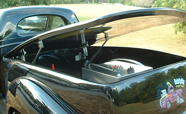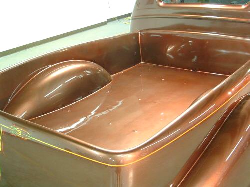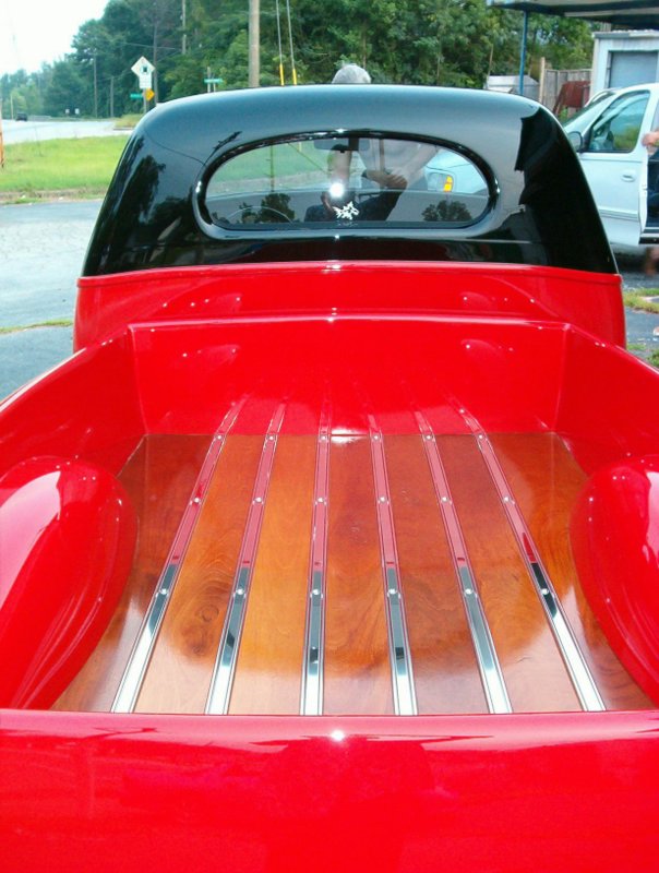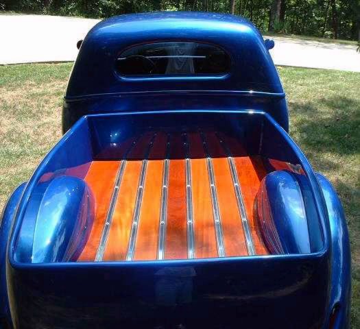 | The bed deck is the most personal touch... A custom bed deck signature is a feature that pickups allow that no other body style offers. The 39's custom wood bed deck is a nice throwback to the days when the early truck beds were decked with planks to accommodate the rugged utilitarian uses of the day. Fast forward to the custom styling of the modern street rod and the look is all new. The bed decks on the 39 Studebaker can be as unique as the imagination allows. This custom deck on this show build (left) is ¾ inch thick furniture grade polished Mahogany, finished to withstand the elements with marine grade lacquer. The hardwood is a nice custom touch but if you'll be using the truck as a daily driver you may consider a more utilitarian deck finish such as plate steel, exterior grade laminate, or rhino lined exterior grade plywood. |