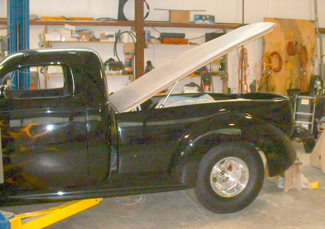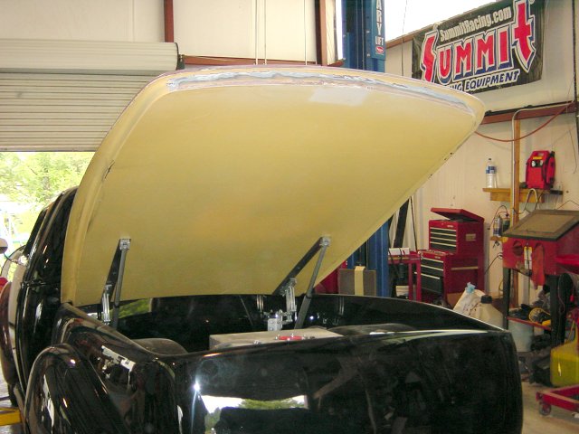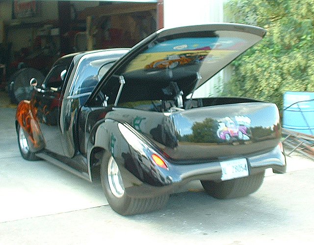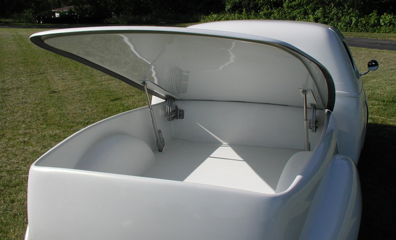 Shown here is the optional bed cover. It is also made of hand laid fiberglass and is custom form fitted to the bed. The cover package comes with heavy duty aluminum hinges and one HD linear actuator. The single actuator is designed to mount in the center of the bed's back wall. For the Pro Street project truck, we used the original plug cover which is extremely heavy, requiring two actuators to facilitate ease of access. Bed cover , hinge set and single actuator = 1495.00 Email for information or questions